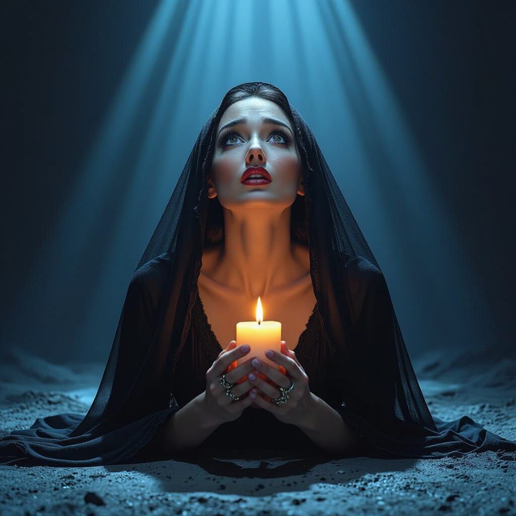 This image depicts a woman's intense awakening, eyes wide with dilated pupils, clutching a candle. A ripped veil surrounds her in a stark, surreal concept art style with dramatic lighting.