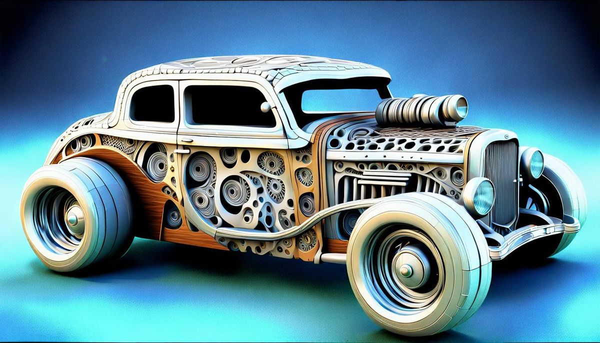This image showcases a collection of 3D ratrod vehicles arranged as an intricate puzzle. The artwork uses abstract fractal and vector elements with 3D shading to convey a complex, fascinating design.