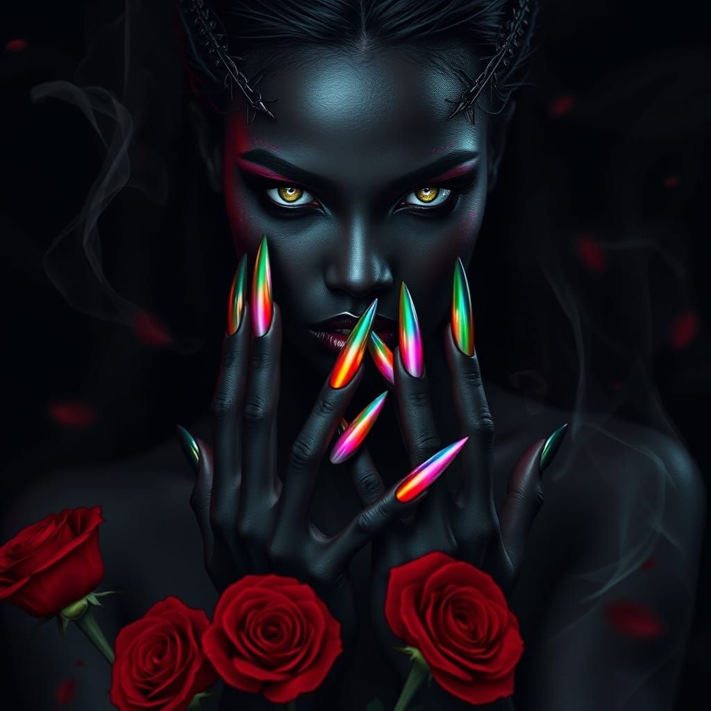This striking image features a dark fae with dark ebony skin, blending into a black background. Her razor-sharp, super long nails radiate a soft, supernatural glow, showcasing a mesmerizing rainbow of colors. Her eyes shine with an otherworldly light, surrounded by dark smoke and blood-red roses, evoking...