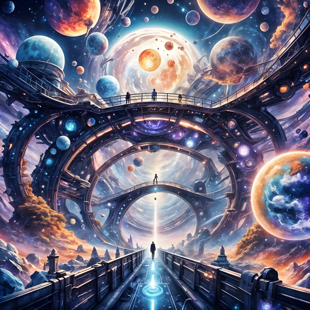 This image shows a breathtaking, high-resolution illustration of a majestic bridge spanning two planets in space, set against a backdrop of twinkling stars. Created with a mix of modern and traditional techniques, this cosmic scene is a stunning example of astral art.
