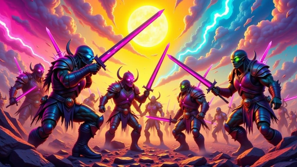 This image depicts a group of orcs in metallic armor clashing on a sun-scorched battlefield, wielding neon-lit popsicle swords, amidst a kaleidoscope of bright, glossy acrylic colors reminiscent of a futuristic world.