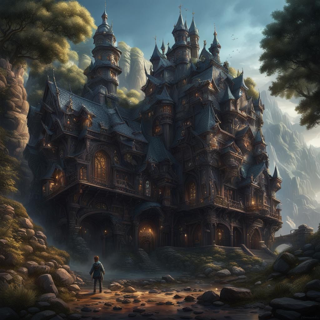 This image is a detailed, high-resolution fantasy concept art piece featuring a young boy with dark hair and a backdrop of intricate, fantastical scenery in deep, rich colors.