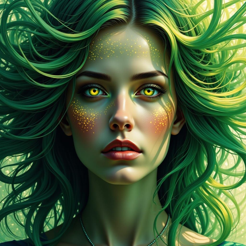 This image shows a woman with emerald hair and golden eyes, her face appearing as fractured light. The background features chaotic pixels and distorted colors, rendered in a glitch art style.