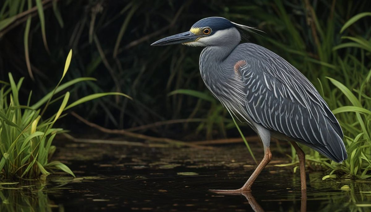 This hyperrealistic splash art concept captures a yellow-crowned night heron in a vibrant swamp. Intricately detailed feathers and lush vegetation are dramatically lit. Digital art, 8k resolution.