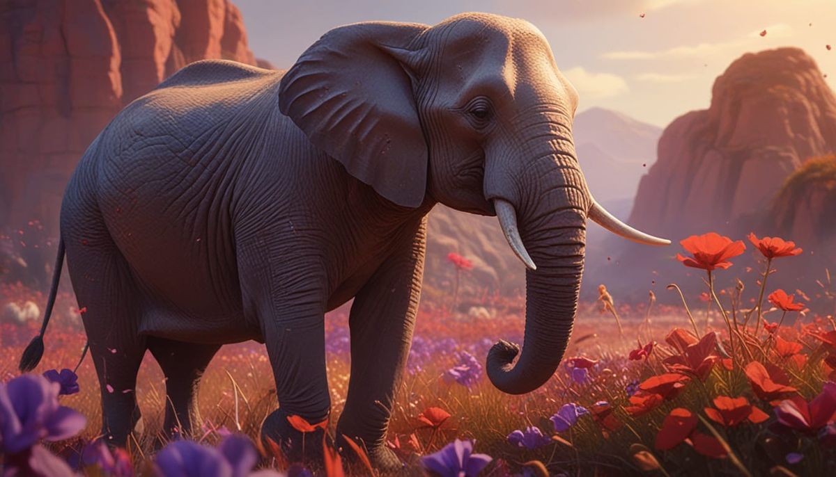A vibrant oil painting depicts a prehistoric elephant in a field of red flowers and purple stones. The artwork features fiery brushstrokes, warm sunlight, and dynamic lighting in a cinematic style.