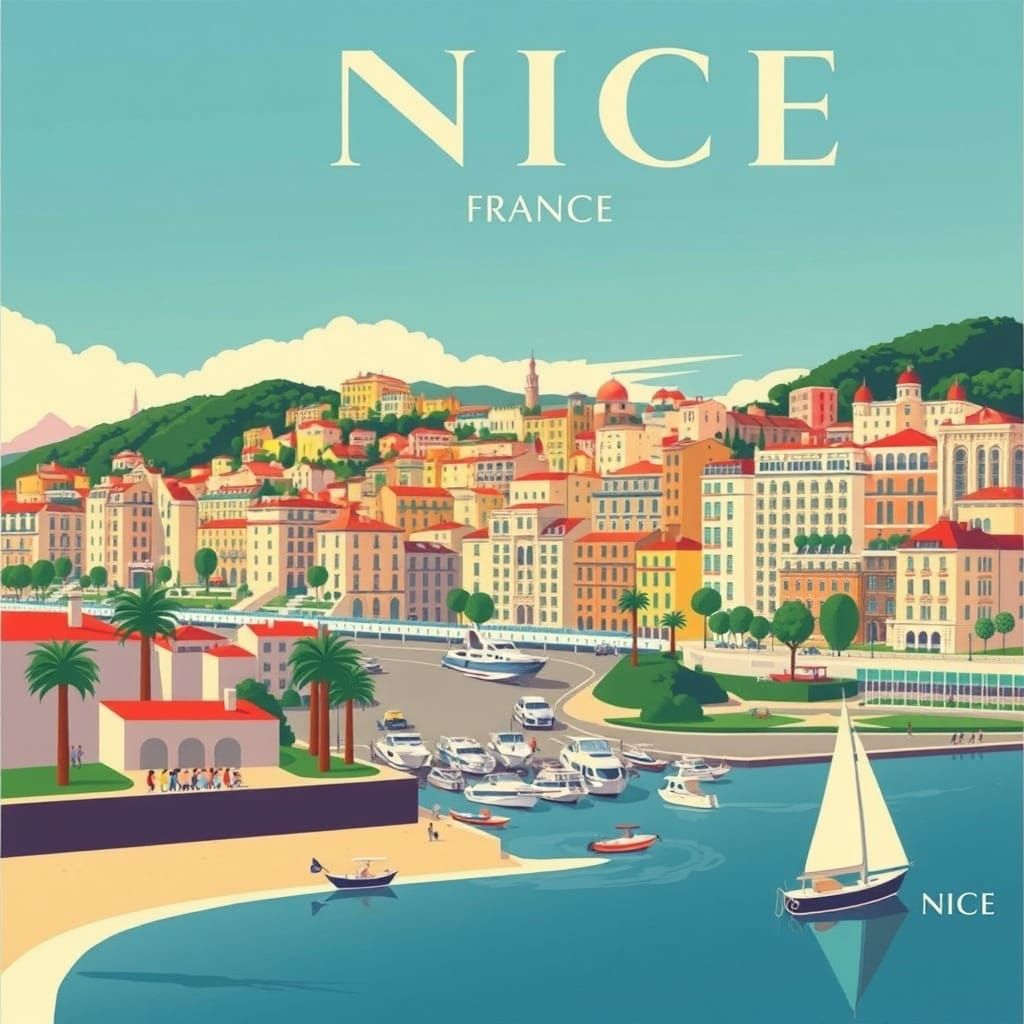 A vibrant travel poster of Nice, France, beckons with vintage charm. The art deco design and bold colors evoke the glamour of the 1940s.