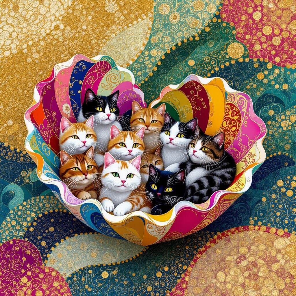 This abstract fractal illustration features many cats inside colorful seashells, inspired by Klimt's gold and aurora borealis hues, rendered with 3D shading and Zentangle patterns.