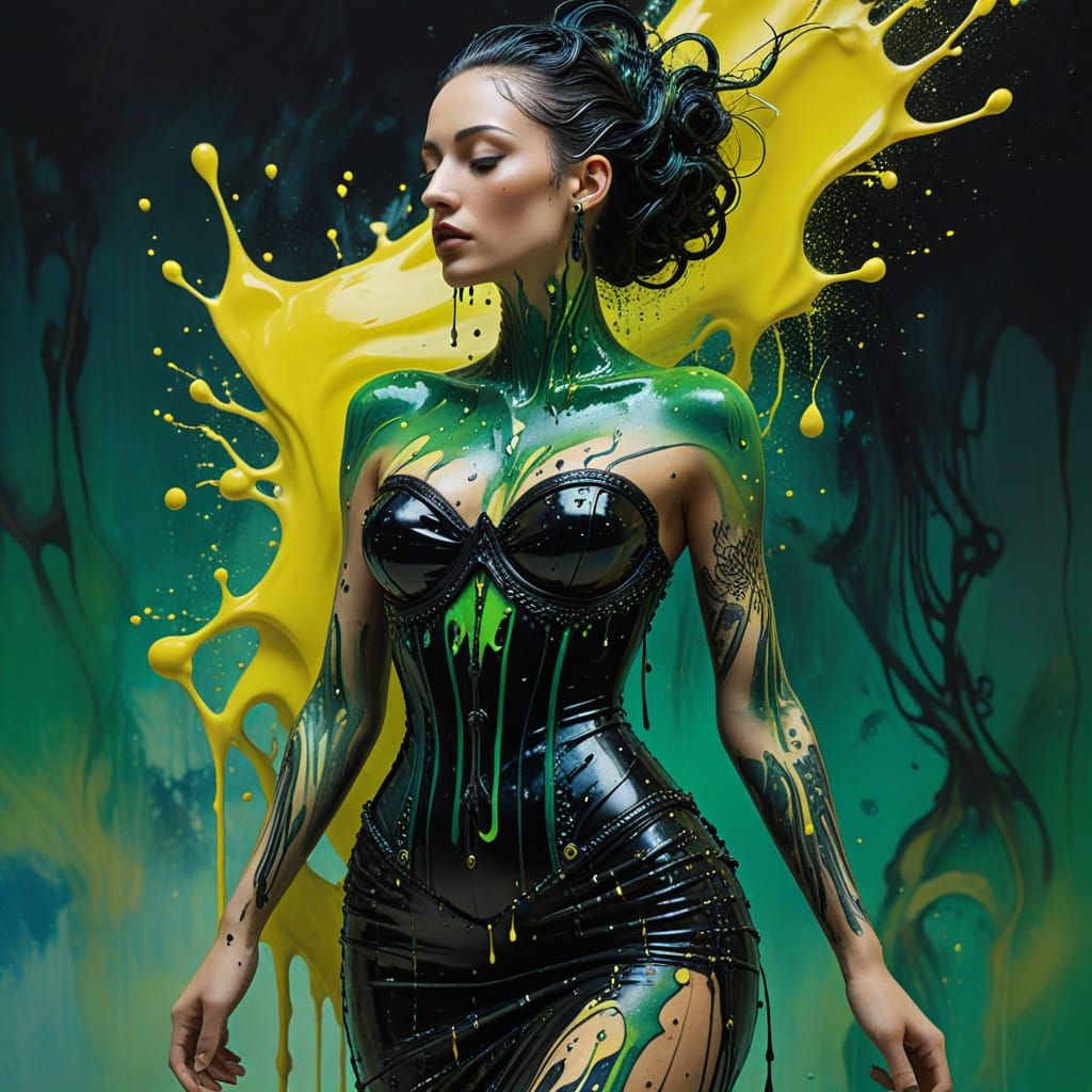 This image shows a surreal water goddess in a black corset dress. The splash art style features vibrant colors, high contrast lighting, and melting oil gouache effects. The artwork has a dreamlike quality.