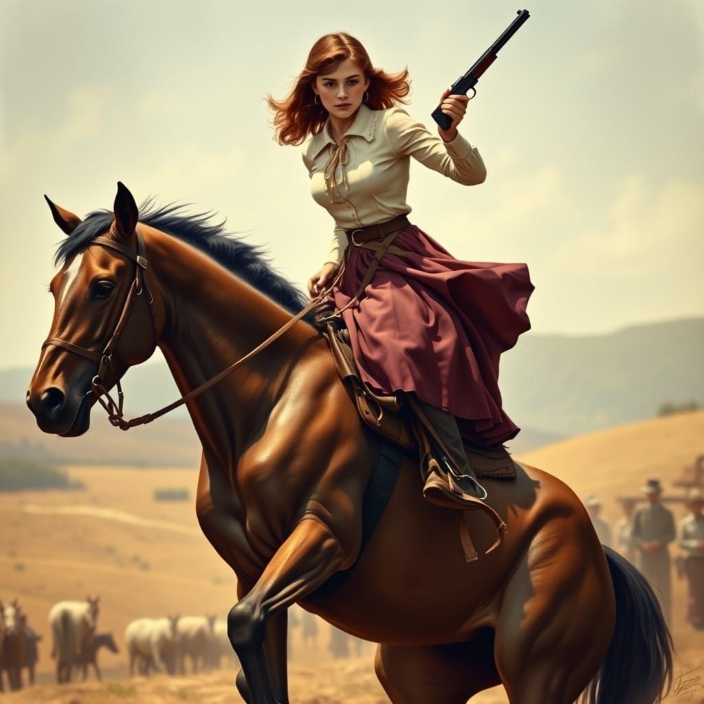 A striking picture of a girl on horseback holding a gun. The horse rears up on its hind legs amid a faded countryside backdrop in a vintage art nouveau style.