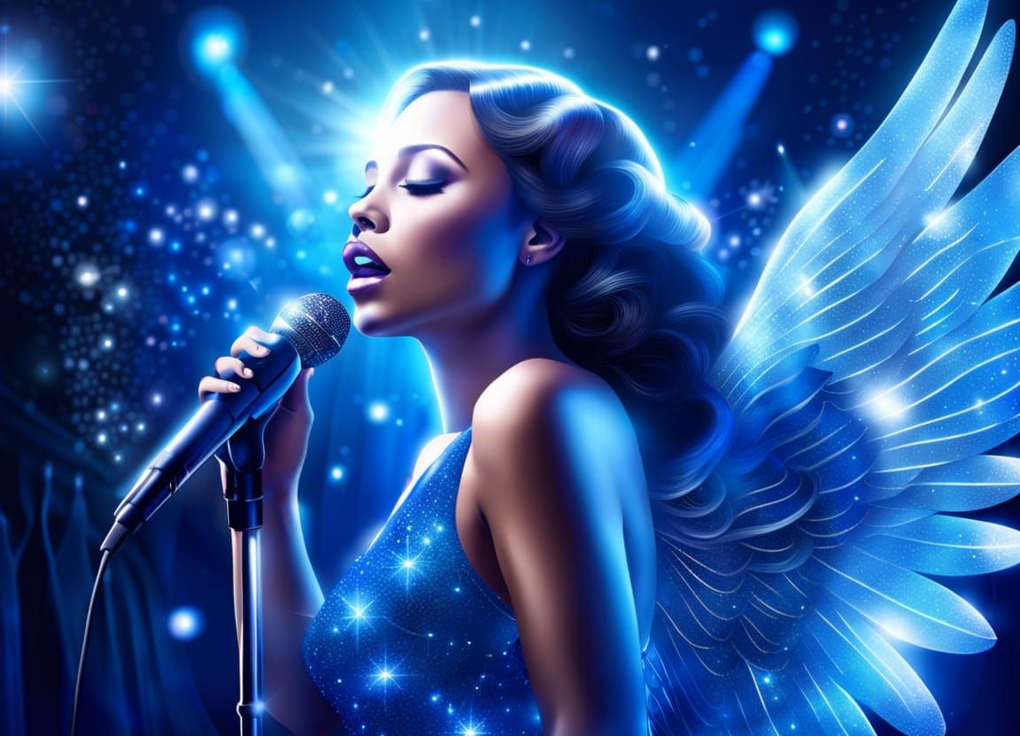 A digital rendering of a beautiful angel in a blue dress singing in a nightclub. The artwork features a shimmering blue aura, velvet textures, and intricate details with elegant, moody lighting.