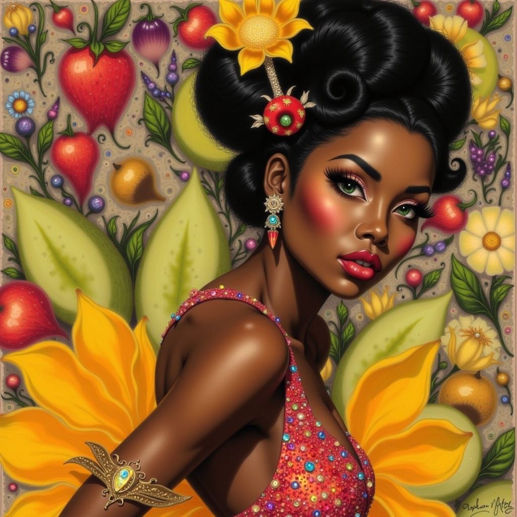 This image shows Josephine Baker as a cabaret dancer and Allied spy during World War II. She is wearing a sequined fruit costume, rendered with bold brushstrokes and vibrant colors.