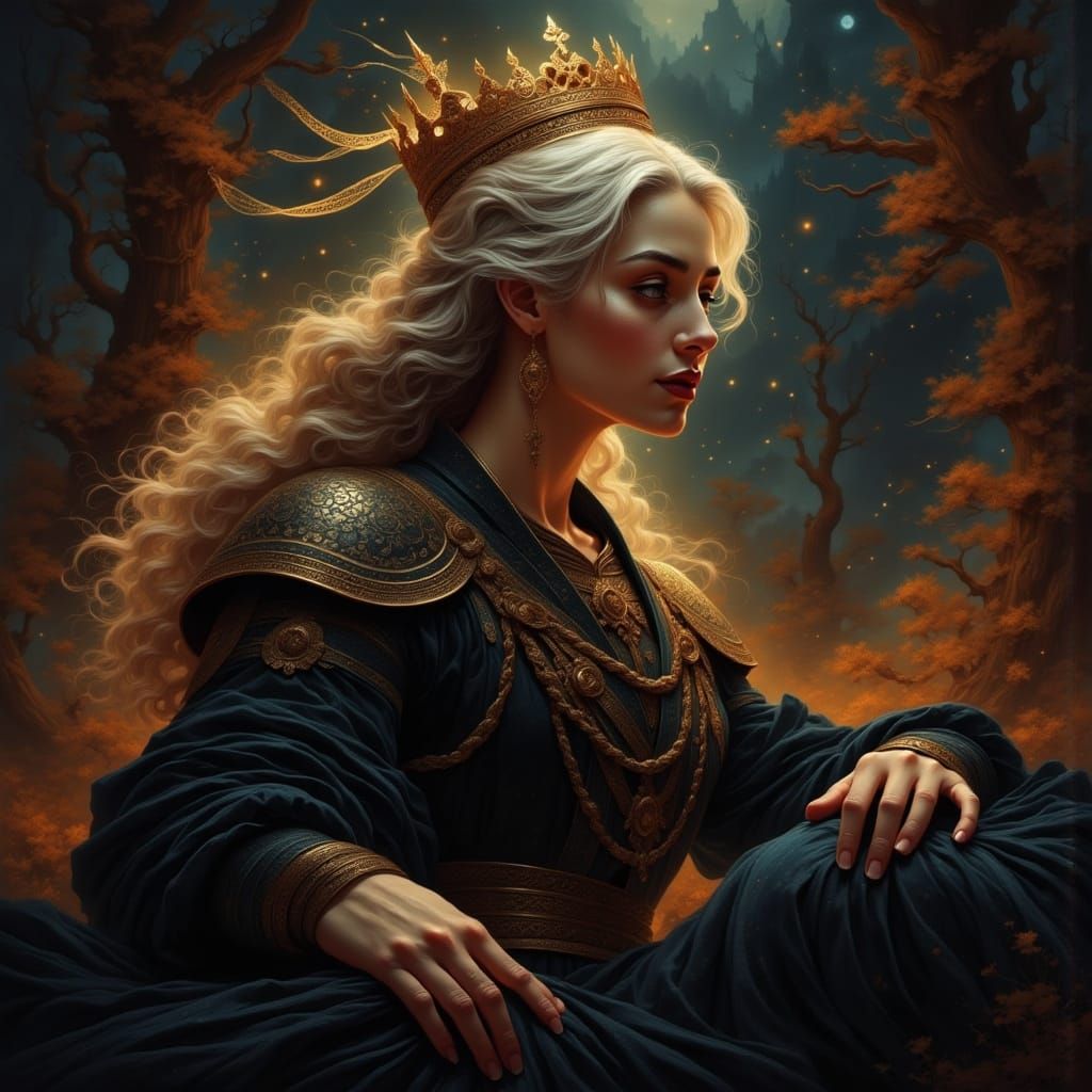 A regal woman adorned with a shining gold crown and a luxurious black velvet dress, captured in the elegant style of the 1800s.