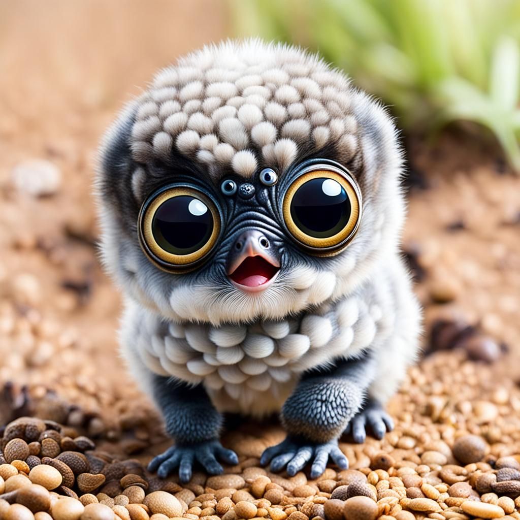 This image shows an AI-generated depiction of a baby animal with large, comical googly eyes, creating a whimsical and humorous effect.