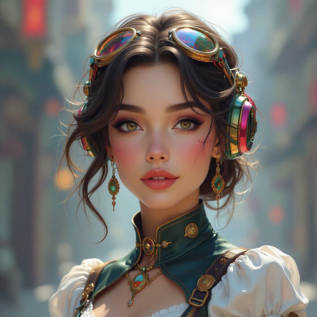 A vibrant, futuristic portrait of a beautiful woman in a steampunk style. Features dynamic lighting and intricate details, presented as concept art.