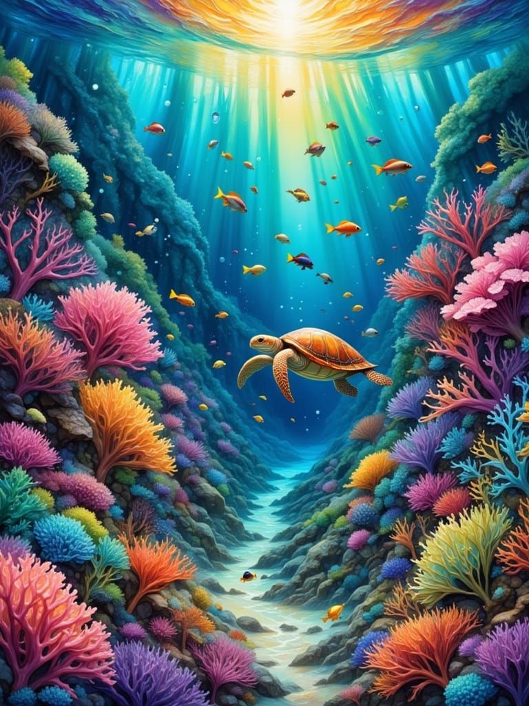 A vibrant coral reef teeming with marine life and a gliding sea turtle. This neo-impressionist image features thick impasto paint textures, luminous bioluminescence, and dreamy lighting.