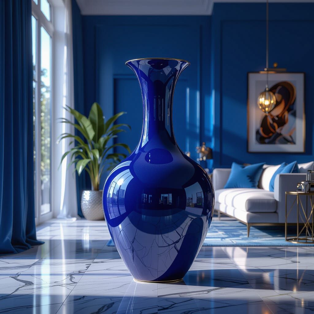 A hyper-realistic interior banner showcases a contemporary living room with a large, glossy royal blue ceramic vase. The scene features deep colors and intricate detail in a matte painting style.