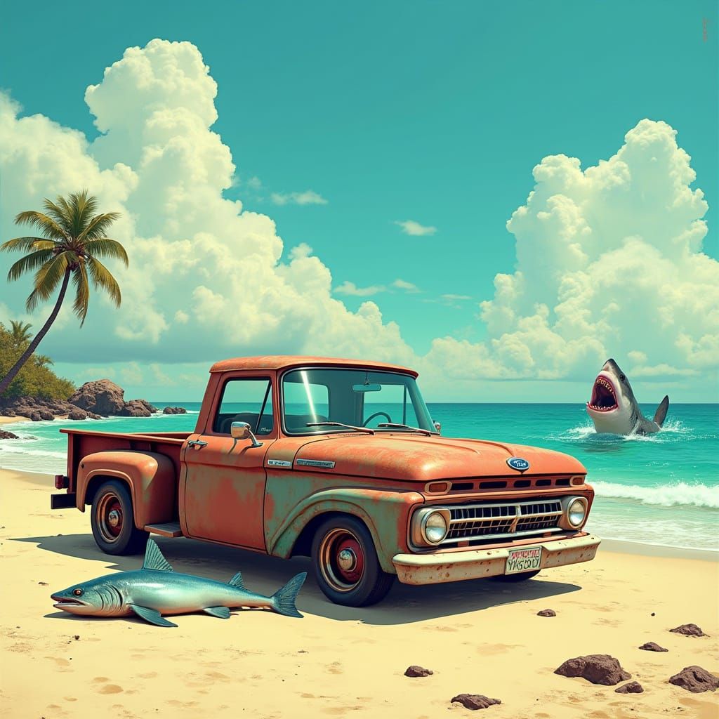 This image shows a vintage Ford truck on a beach with a shark eating a fish beside it. The scene is rendered with vibrant colors and a gritty, futuristic aesthetic.