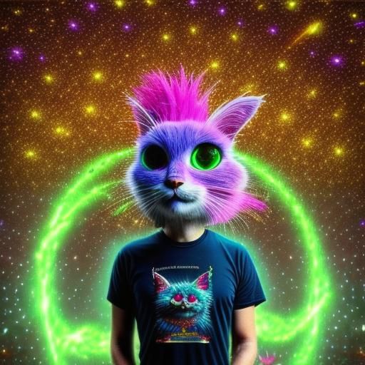 A vibrant image of small, furry anime-style creatures playing under a table. This mixed media illustration, in an astral cosmic style, evokes holographic and magical themes.