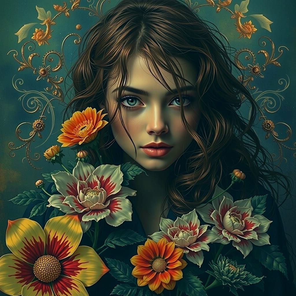 This image shows a hyperrealistic, ultra-quality portrait featuring intricate details and deep, dramatic colors. The background is vibrant and colorful, creating a fantastical aesthetic.