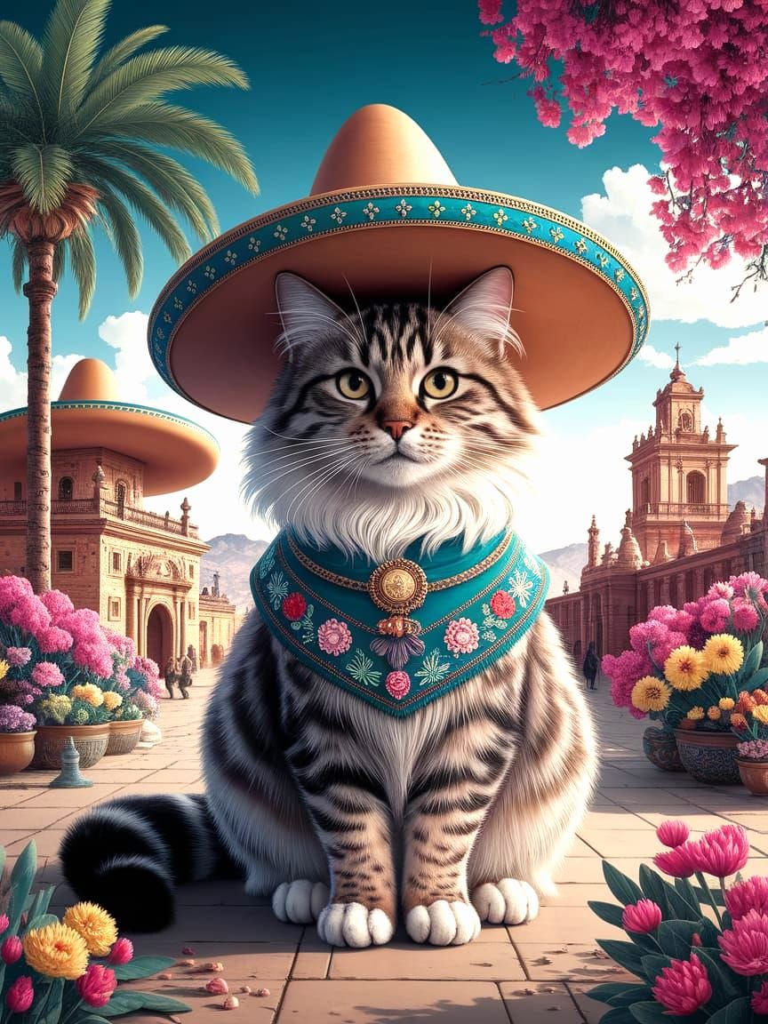 This image showcases a fluffy, elegant cat wearing a sombrero and sitting in a Mexican landscape. The image is reminiscent of a fine art photograph, with intricate details and cinematic HDR.