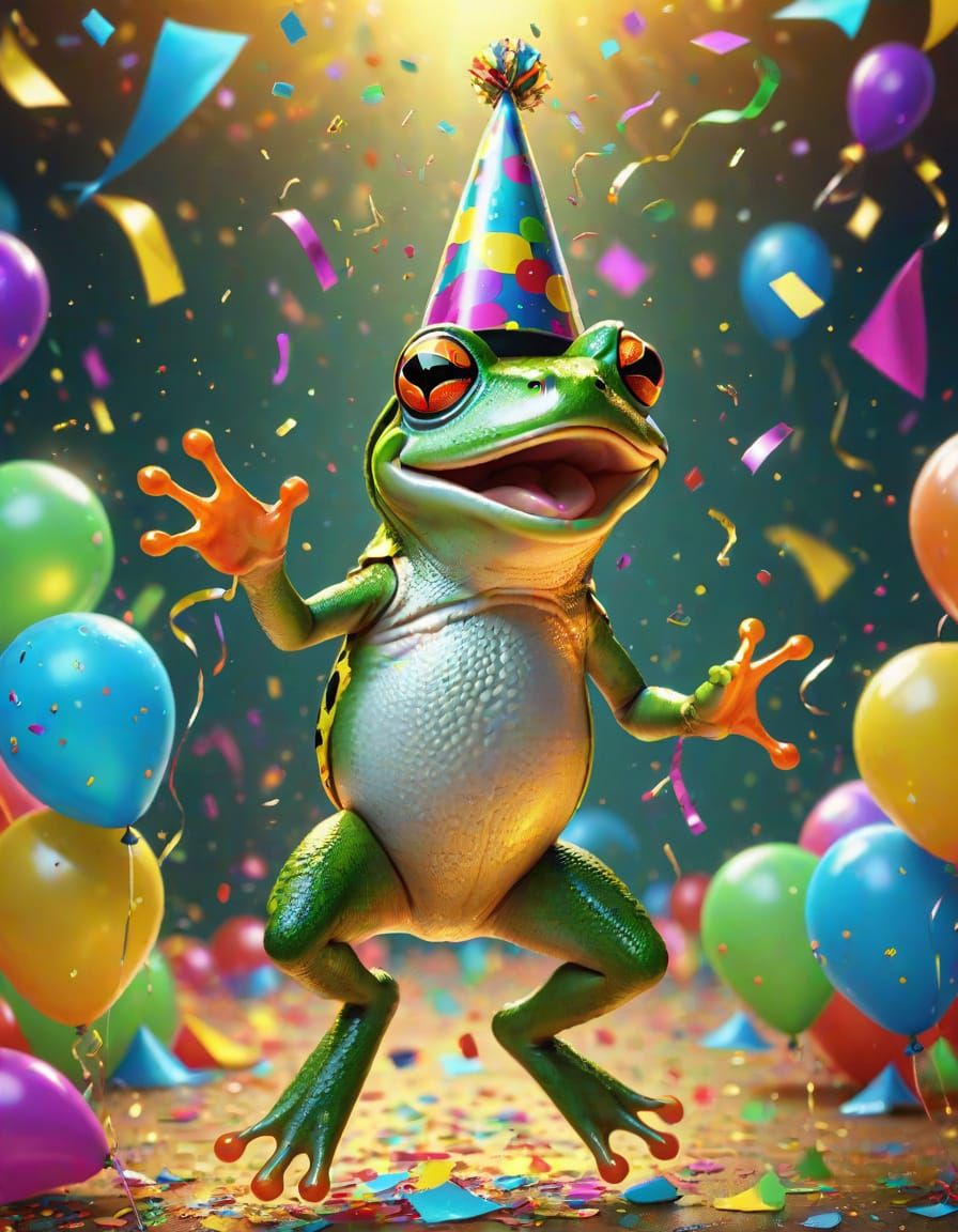 A vibrant digital art piece captures a frog mid-leap, adorned with a glowing party hat, surrounded by confetti and balloons. The image features warm lighting and playful, celebratory energy.