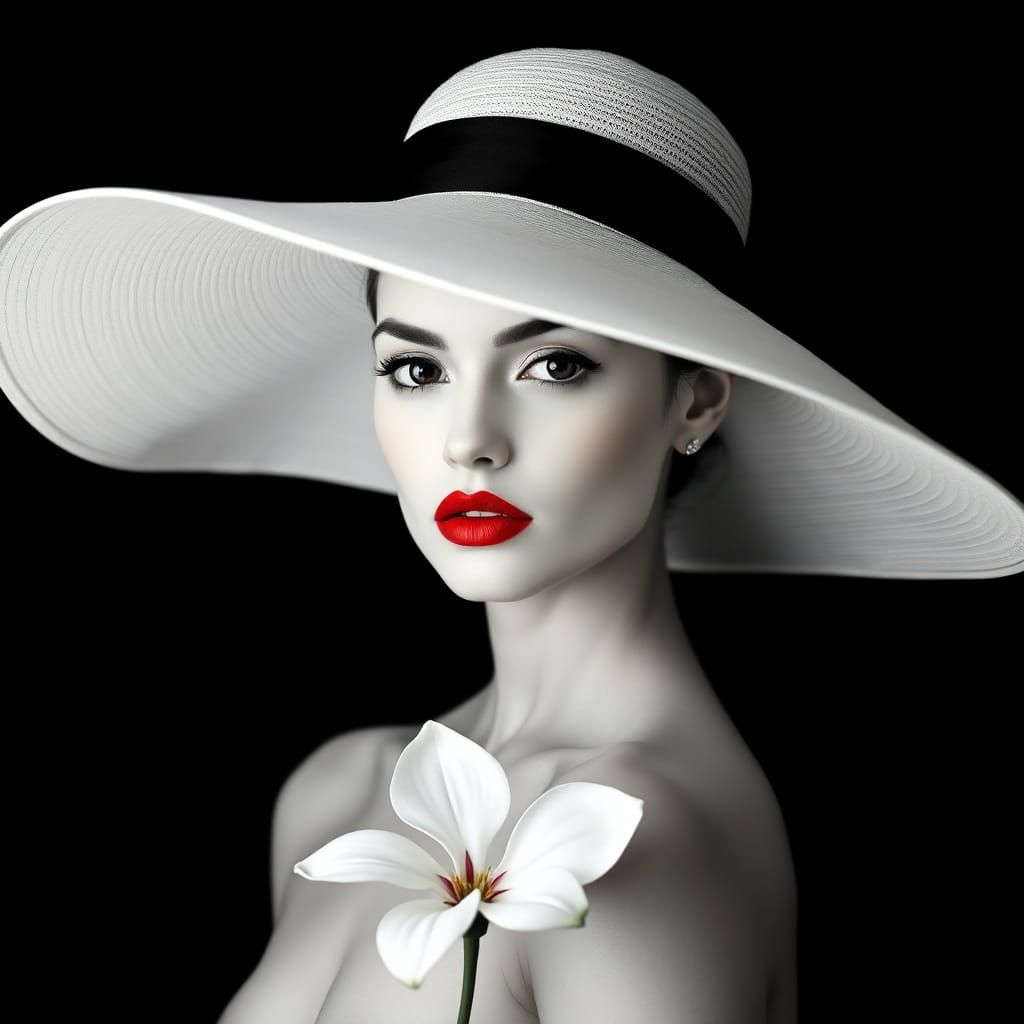 A monochrome portrait of a woman with porcelain skin and red lips, wearing a wide-brimmed hat, set against a black backdrop. The image features high contrast and dramatic lighting, in a minimalist aesthetic.