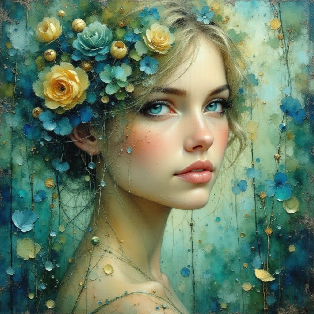 A vibrant, dreamlike fantasy image featuring fluid, transparent, and colored water. The artwork exhibits a soft, painterly style with impasto and impressionistic influences, rendered in deep green, silver, gold, and blue tones.