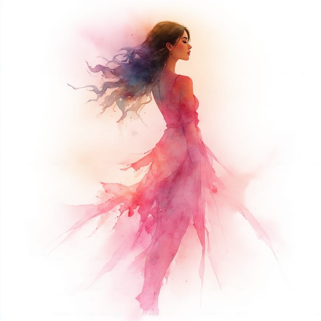 This image features a portrait of a bohemian dancer, Esmeralda, enveloped in delicate pink and gold watercolor mist. The pigments fade softly into a white background.