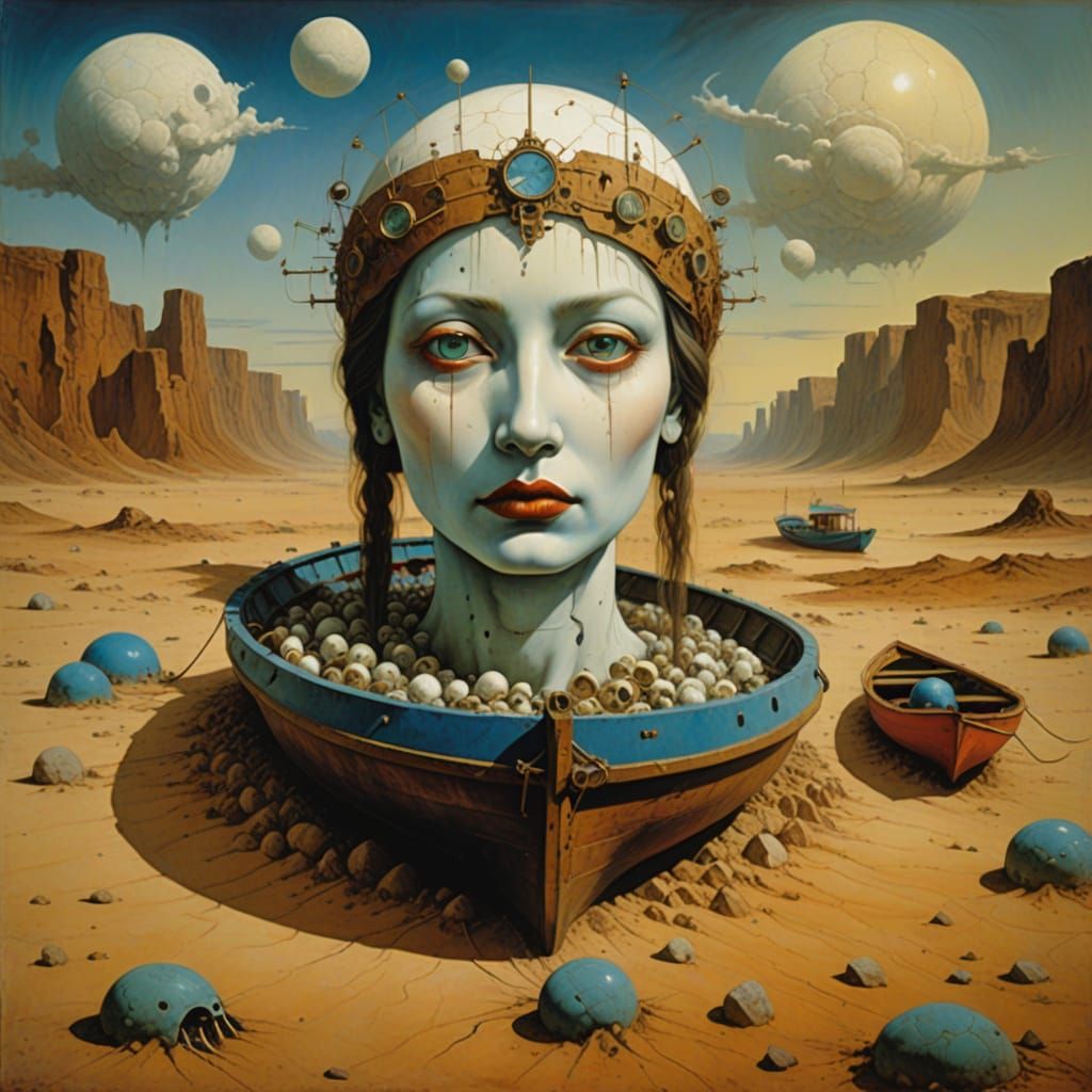 A close-up portrait of an elegant female humpty with a pale face and striking eyes, set against a surreal desert oasis scene with a harlequin lady in a boat, surrounded by Salvador Dali-inspired clouds and vibrant, electric colors.
