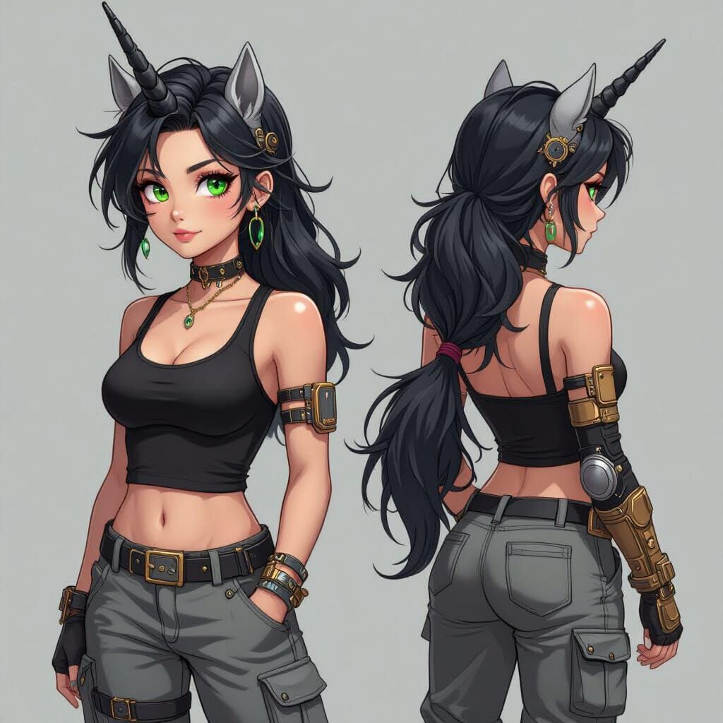 This image shows an anthropomorphic unicorn with a steampunk aesthetic. The character features green eyes, black hair and tail, and wears a tanktop and cargo pants. The style emphasizes intricate textures.
