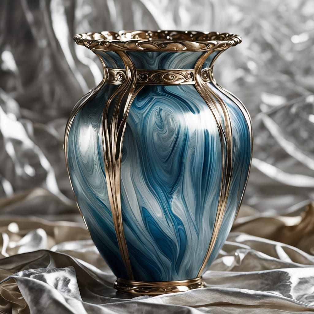 This image shows a stunning, close-up view of a marbled Murano glass vase, set against a backdrop of crumpled aluminum and silver silk sheets. The glass features intricate, reflective patterns, while the silk adds a touch of shimmering texture.