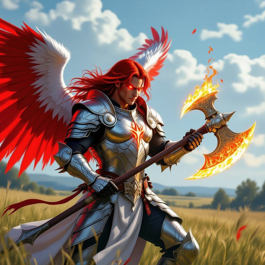 This image shows an androgynous angel in silver armor with red hair and wings, wielding a flaming axe in a field. Runes glow on the angel's body, set against a cloudy sky.