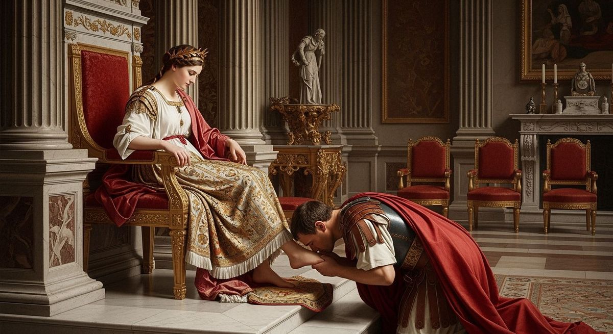 This image depicts Empress Messalina on an opulent throne, a senator kneeling to kiss her feet. The scene is reminiscent of classical paintings, rendered with photorealistic detail and natural lighting.