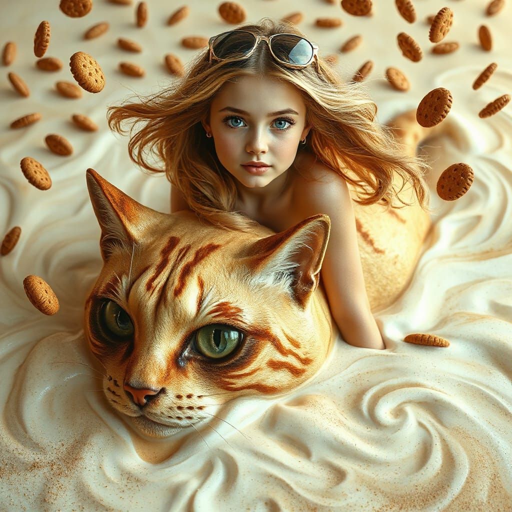 This AI-generated image depicts a woman with golden hair and blue eyes on a massive coffee cat. The scene features a sea of cappuccino foam and floating cookies, with a warm, ethereal glow.
