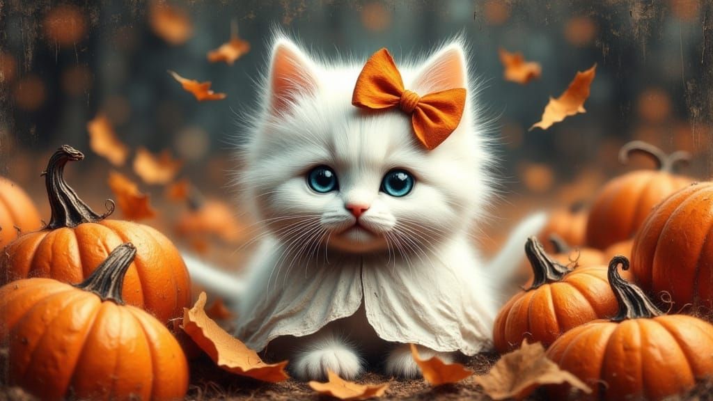 Generate adorable white kitten ghost pictures for free. Easy and fun AI image creation.