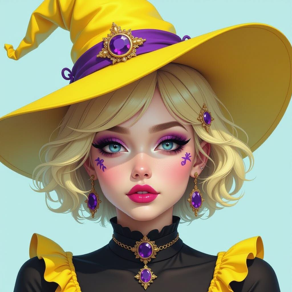 realistic image of a young lady with short fluffy neon yellow hair and blue eyes wearing a neon yellow witch's hat with detailed neon purple details. she has skin as white as snow and is wearing extreme black cat eye makeup and dark pink lips vivid, detailed, acrylic oil