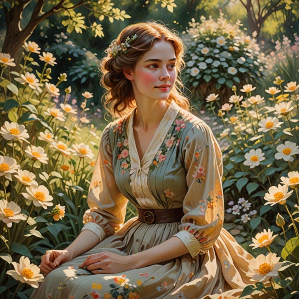This image shows a woman with flowers in her hair, sitting in a serene garden during golden hour. Rendered with impressionistic brushstrokes, it evokes a dreamlike and romantic atmosphere with delicate floral details and flowing fabric.
