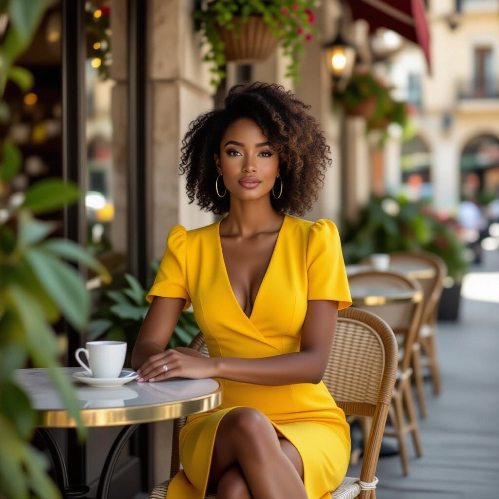 This image shows a fair-skinned, Black woman in her twenties sitting at an upscale outdoor cafe. She wears a lemon yellow dress and white sandals. The image has a hyperrealistic and sophisticated aesthetic.