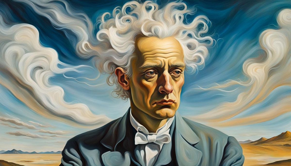 A surreal portrait of a young Arthur Schopenhauer contemplating. The artwork blends melting clocks and wispy hair with soft brushstrokes. The piece evokes intimacy through warm light and earthy tones in a surreal style.