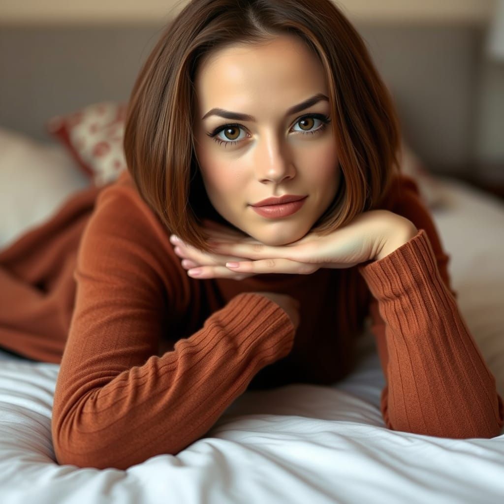 A striking picture of a woman with bobbed hair in a rust-colored sweater and skirt, reclining on a bed. Her gaze is direct, rendered with a soft focus and shallow depth of field in an art nouveau style.