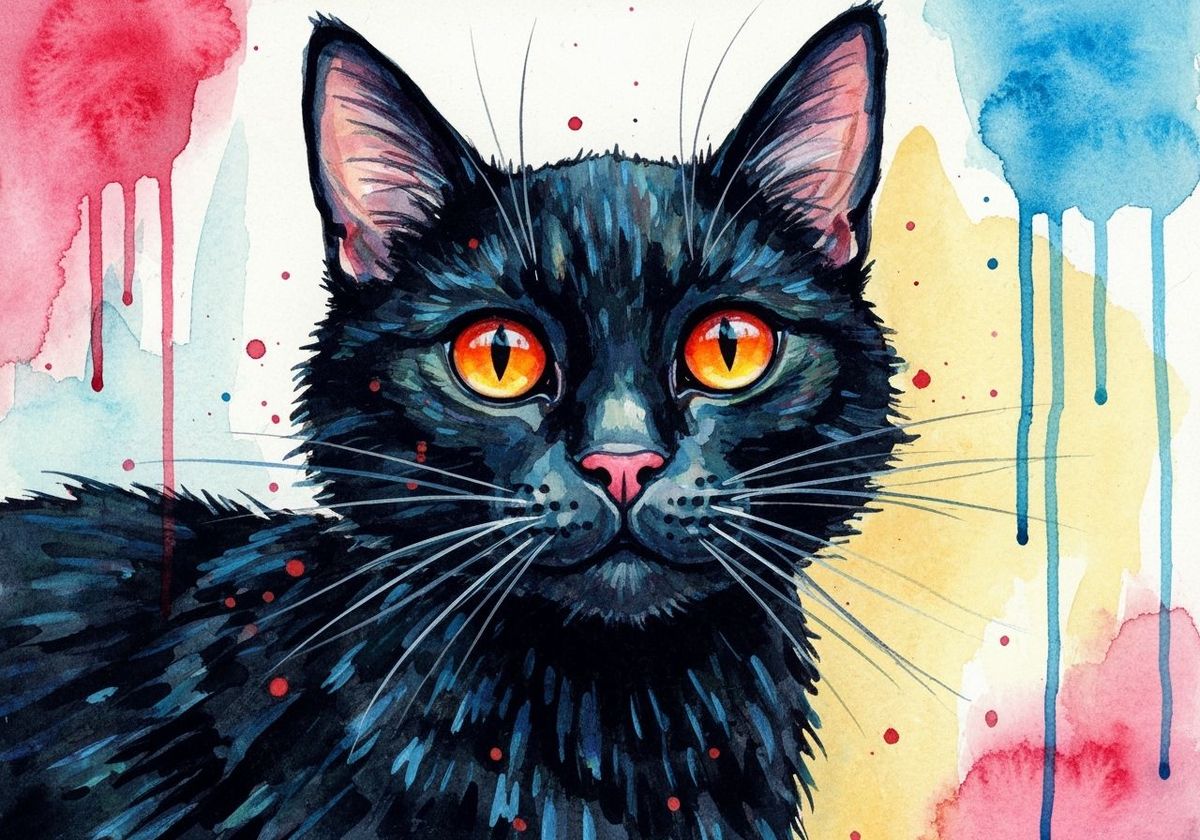 A vibrant watercolor painting of a black cat with striking orange eyes, rendered in a whimsical and fantastical style with bold brushstrokes.