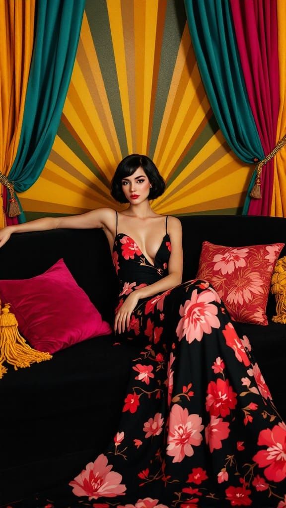 This image features a chic woman reclining on a black couch, wearing a flowing black dress with oversized pink and red floral patterns, set against a vibrant, theatrical lounge backdrop with jewel-toned curtains and colorful tasseled pillows.