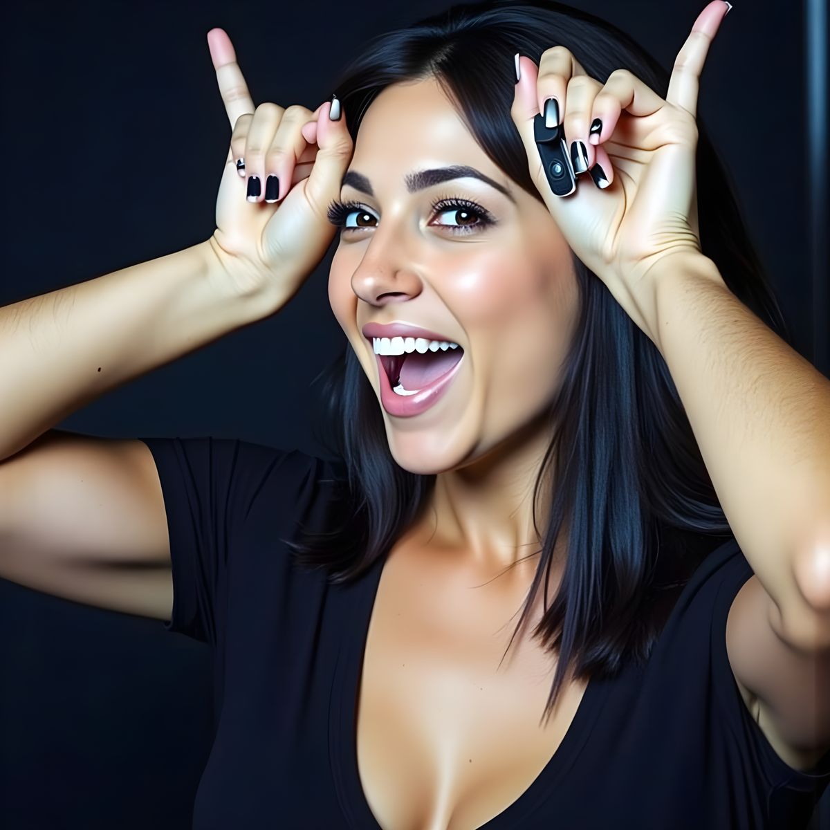 A portrait of a woman with high cheekbones, long brown hair, and a mischievous smile, giving a cheeky gesture with her hands while wearing a low-cut black t-shirt