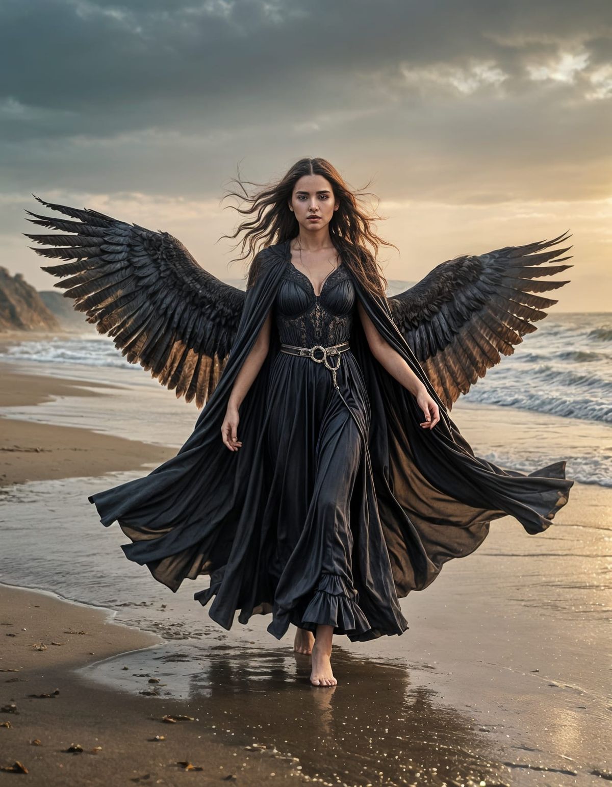 A striking picture of a winged woman walking along a misty beach, her cloak trailing in the sand. The image shows a fantasy scene with gothic undertones.