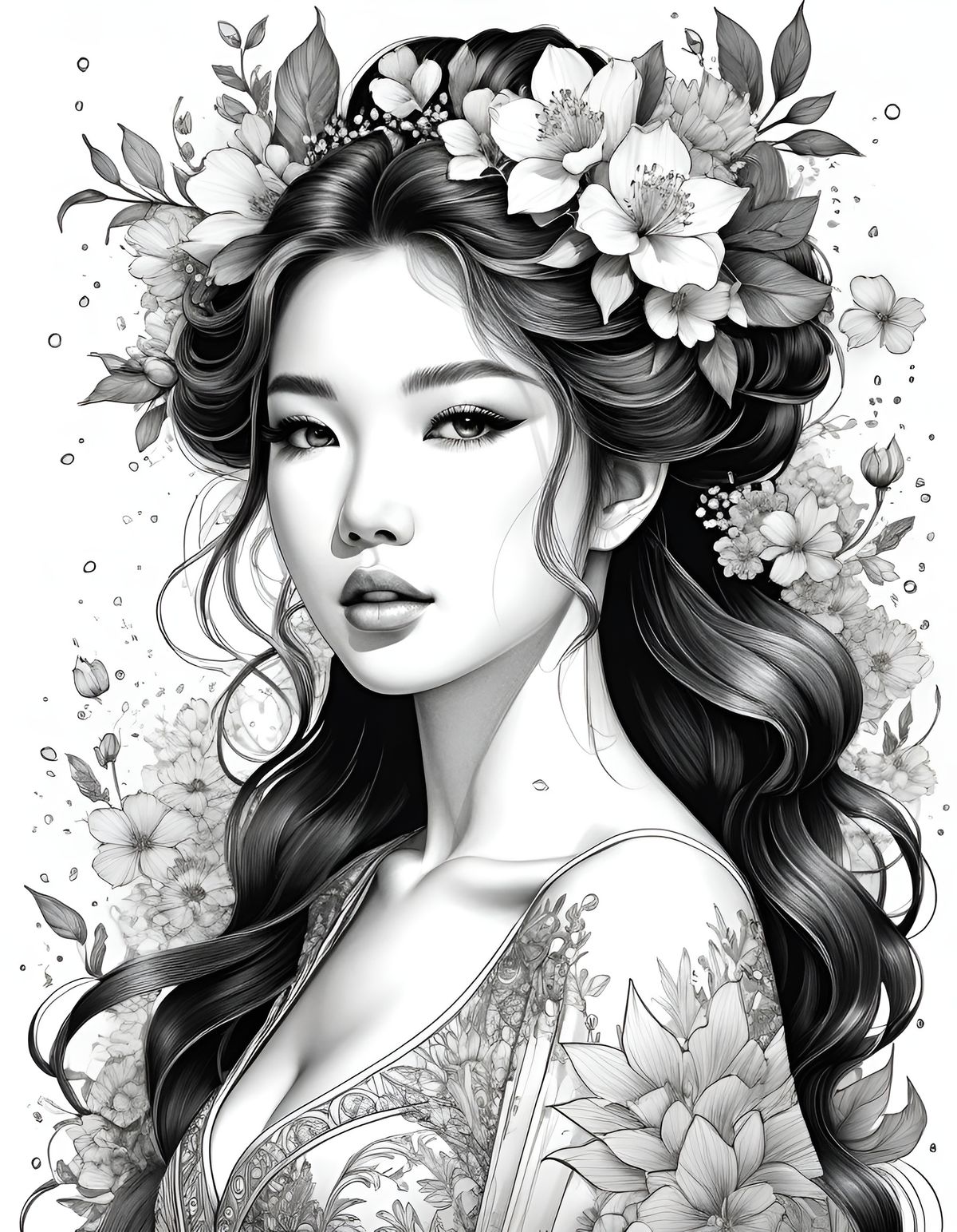 Flower Goddess, Graphic Pen and Ink Black and White illustration