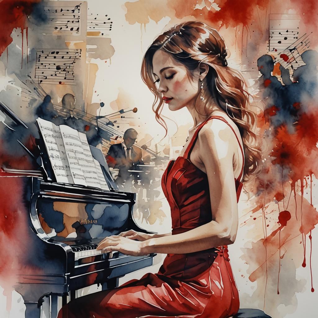 This image shows a beautiful woman in a red dress playing piano, set against an orchestra with rich background colors. The artwork uses a watercolor double exposure effect.