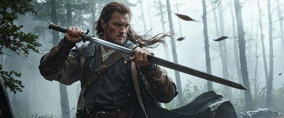 A striking picture of a character holding a sword hilt, wearing a leather vest and cape. The cinematic shot, with moisture and highlights, is rendered with film grain and earthy tones for a dramatic, frozen-in-time aesthetic.
