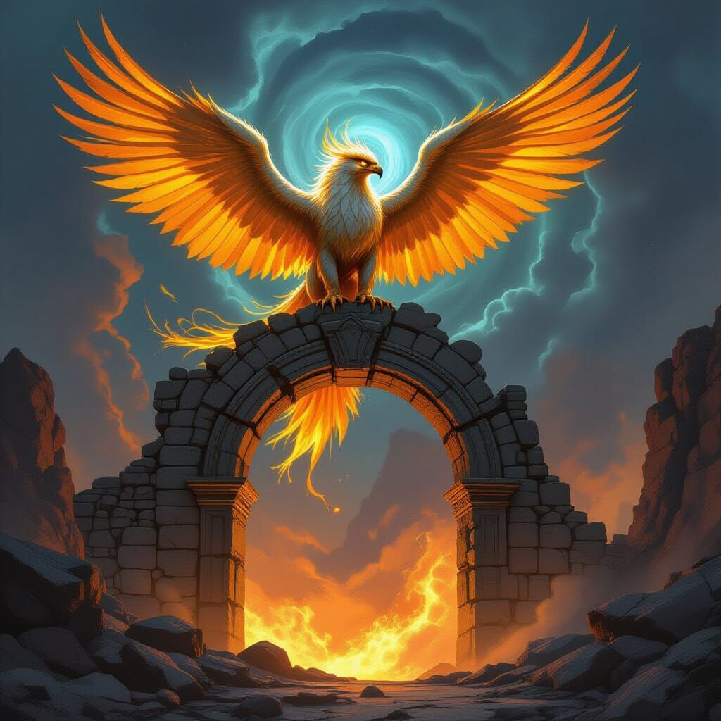 A striking picture of a griffin with fiery eyes and golden feathers guarding a crumbling stone archway. The desolate landscape below features swirling cosmic energy. This fantasy art has dramatic high contrast and painterly textures.