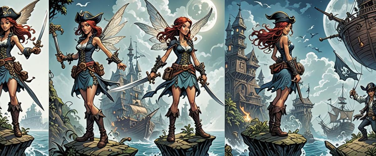 This image shows a whimsical pirate fairy in a comic book art style, with smooth lines and vibrant colors, evoking a sense of adventure and fantasy.