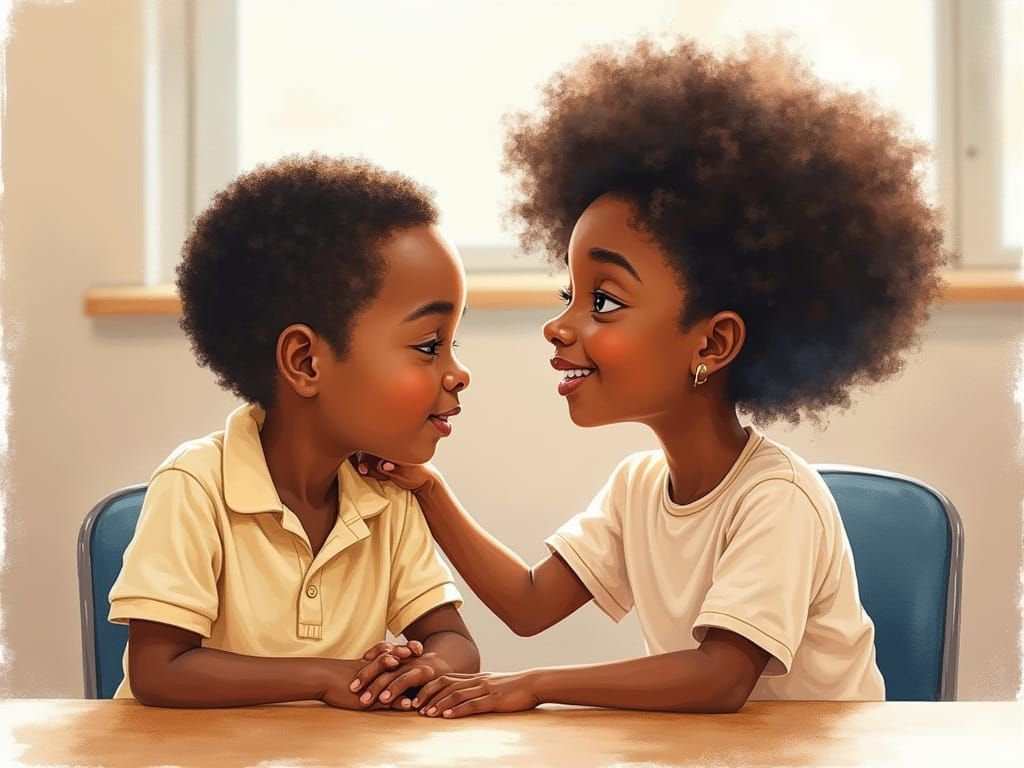 This image shows two African American children at school, in soft photorealistic watercolor. One child offers a gentle smile and places a hand on the shoulder of another, conveying quiet compassion.